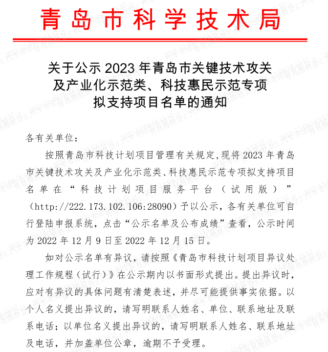 祝贺!青岛懂球帝app官网成功揭榜2023年青岛市科技计划关键技术攻关项目