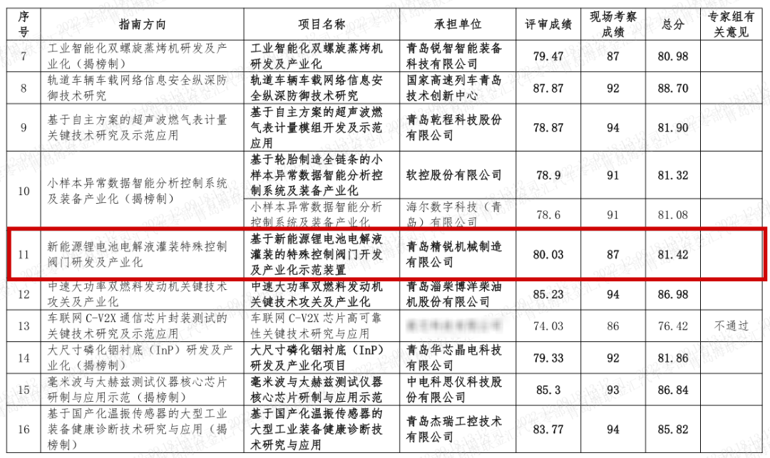 青岛懂球帝app官网机械制造有限公司经答辩、专家现场审核等评价步骤,不负众望,以总分81.42分的成绩成功揭榜并承担了青岛市2023年科技计划关键技术攻关及产业化示范类专项项目—新能源锂电池电解液灌装特殊控制阀门研发及产业化,标志着公司行业领军企业开展的目标初步达成。